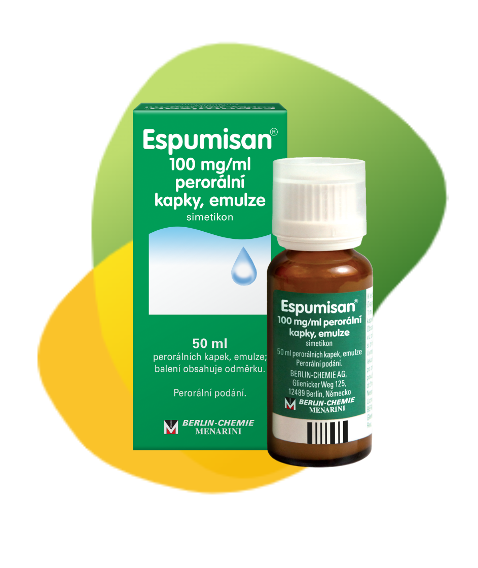 Volně prodejný lék Espumisan® kapky obsahuje simetikon. K vnitřnímu užití.
