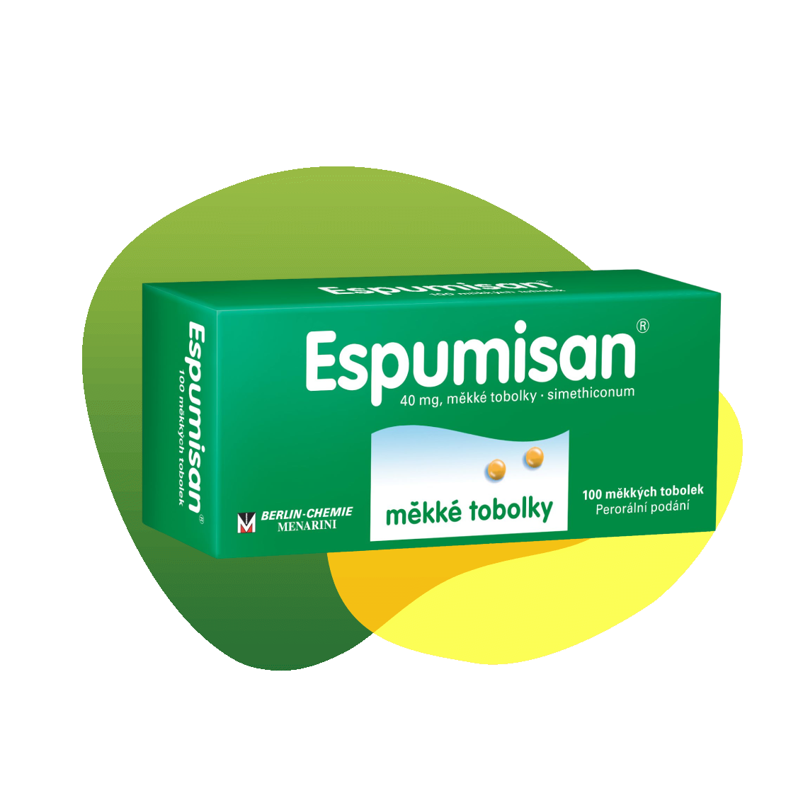 Volně prodejný lék Espumisan® tobolky obsahuje simetikon. K vnitřnímu užití.